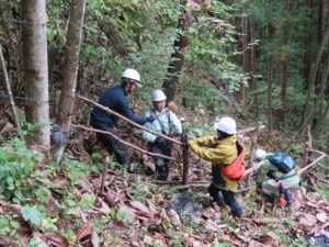 21名が参加して(写真-2)、伐開地の下刈り(写真-3)、防鹿柵の交換設置(写真-4)を行うとともに、ノウサギ隠れ家の修理を行いました。日本野鳥の会本部からも田尻浩伸自然保護室長と稲葉一将さんに参加頂きました。午後になってツキノワグマ2頭(親子連れ)が、参加者のすぐそばに出現したため急遽活動を中止して下山しました。
