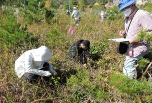 16名が参加し(写真-1)、作業路の整備、既存の帯状伐開地の下刈、シカ侵入防止用針シートの敷設、シカ糞のカウント、記念碑の清掃などを行いました。